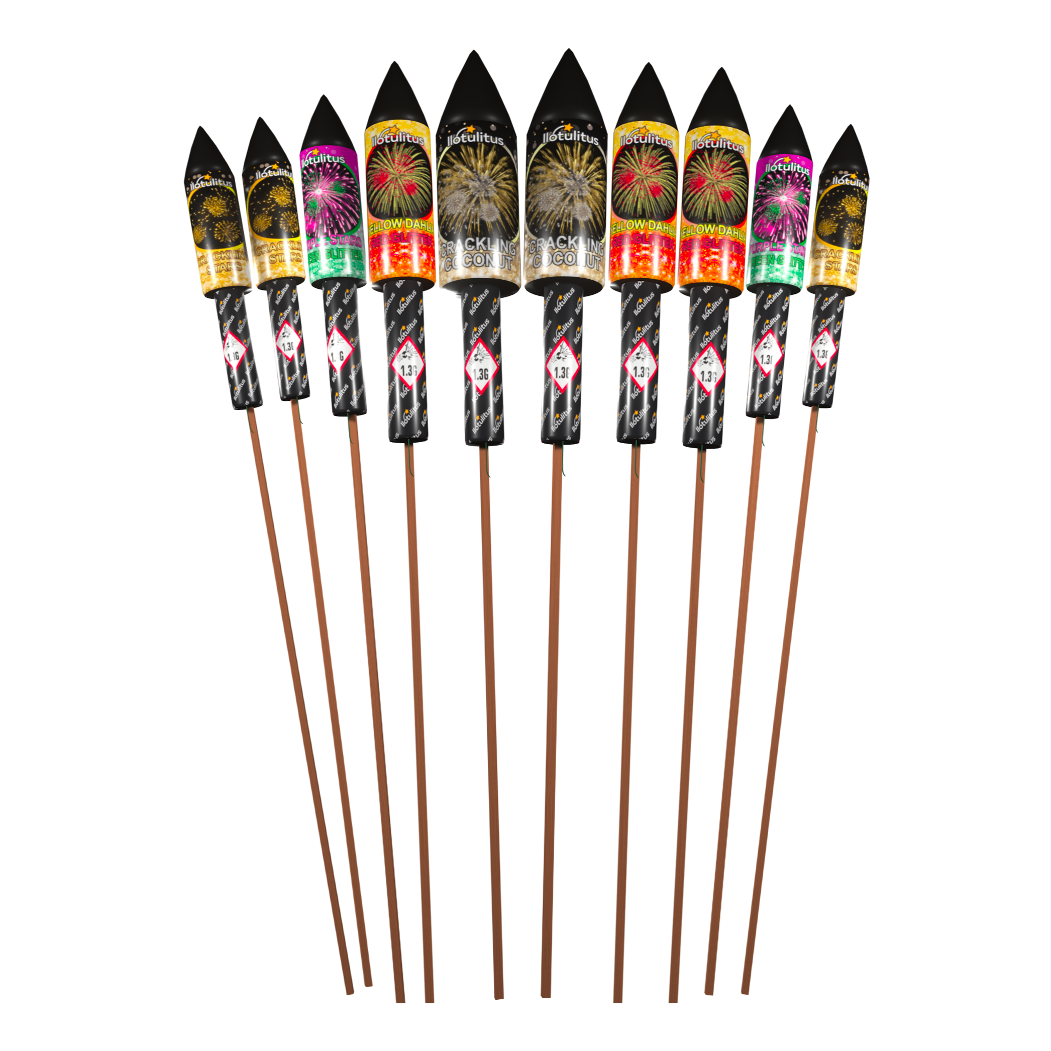 10 raketin tehokas pakkaus raketteja, jotka varustettu upeilla efekteillä. Vain suurimmat ja isoimmat ohjukset on hyväksytty tähän jättilajitelmaan!